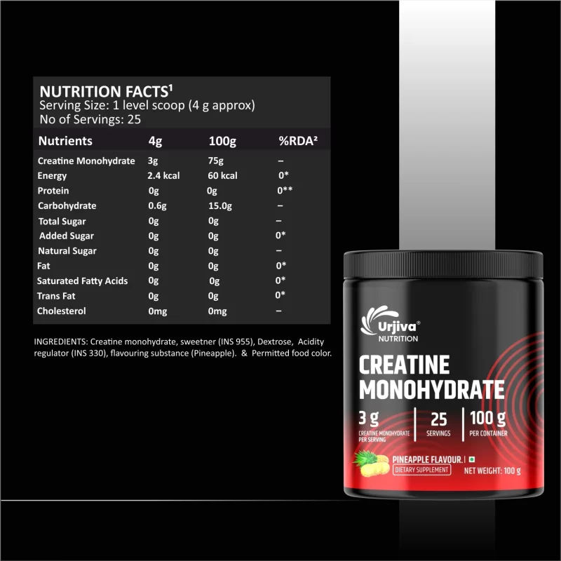 Power up your workouts with the tropical punch of Urjiva Nutrition Creatine Monohydrate – Pineapple Flavour! Formulated with high-quality micronized creatine monohydrate and infused with a refreshing pineapple taste, this supplement is designed to enhance your strength, stamina, and recovery – all while keeping your taste buds delighted.